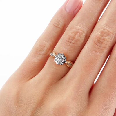 Кольцо с 1 бриллиантом природным, 0.01 карат, огранка круг 57 граней, цвет 4, чистота 6, тип огранки А; 14 бриллиантами природными, 0.04 карат, огранка круг 17 граней, цвет 2, чистота 2, тип огранки А; Желтое и белое золото 585 пробы.