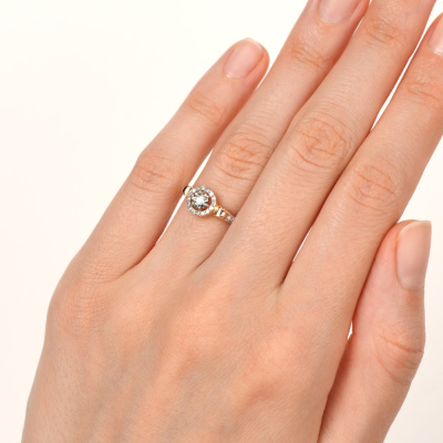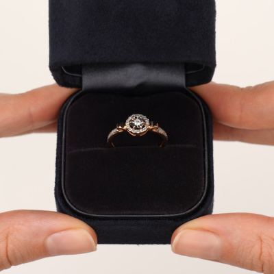 Кольцо с 1 бриллиантом природным, 0.03 карат, огранка круг 57 граней, цвет 3, чистота 6, тип огранки А; 30 бриллиантами природными, 0.14 карат, огранка круг 17 граней, цвет 2, чистота 2, тип огранки А; Розовое и белое золото 585 пробы.