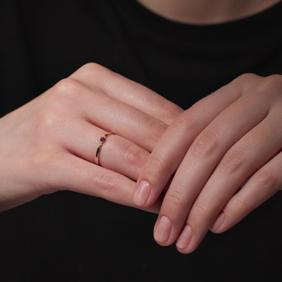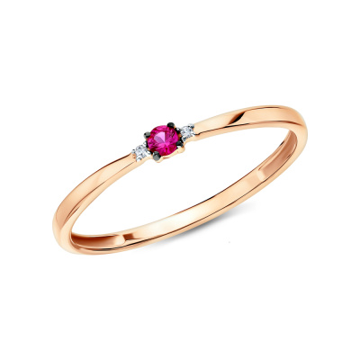 Кольцо с 2 бриллиантами природными, 0.01 карат, огранка круг 17 граней, цвет 2, чистота 2, тип огранки Б; 1 рубином природным, 0.09 карат, цвет 2, чистота 2, тип огранки В; Розовое золото 585 пробы.