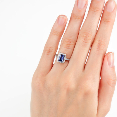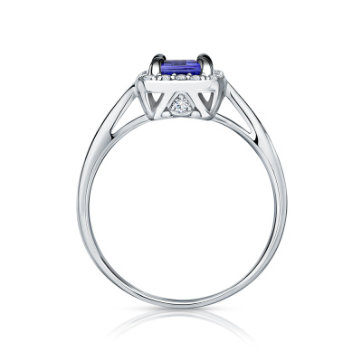 Кольцо с 2 бриллиантами природными, 0.03 карат, огранка круг 57 граней, цвет 4, чистота 6, тип огранки А; 20 бриллиантами природными, 0.15 карат, огранка круг 57 граней, цвет 4, чистота 6, тип огранки А; 18 бриллиантами природными, 0.08 карат, огранка круг 57 граней, цвет 4, чистота 6, тип огранки А; 1 танзанитом природным, 1.05 карат; Белое золото 585 пробы.