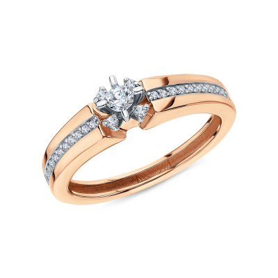 Кольцо с 1 бриллиантом природным, 0.07 карат, огранка круг 57 граней, цвет 3, чистота 5, тип огранки А; 4 бриллиантами природными, 0.03 карат, огранка круг 17 граней, цвет 2, чистота 3, тип огранки Б; 22 бриллиантами природными, 0.08 карат, огранка круг 17 граней, цвет 2, чистота 3, тип огранки Б; Розовое и белое золото 585 пробы.