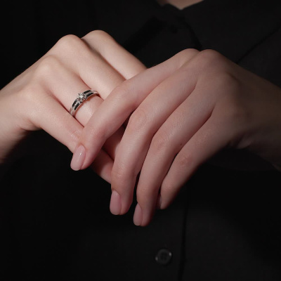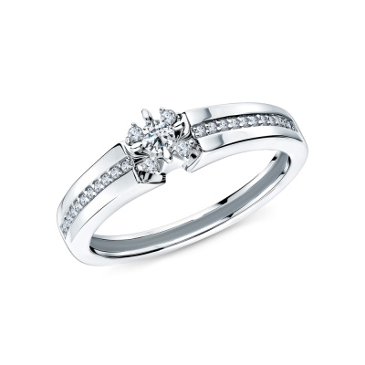 Кольцо с 1 бриллиантом природным, 0.07 карат, огранка круг 57 граней, цвет 3, чистота 5, тип огранки А; 4 бриллиантами природными, 0.03 карат, огранка круг 17 граней, цвет 2, чистота 3, тип огранки Б; 22 бриллиантами природными, 0.07 карат, огранка круг 17 граней, цвет 2, чистота 3, тип огранки Б; Белое золото 585 пробы.