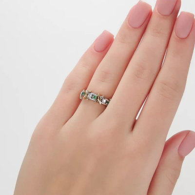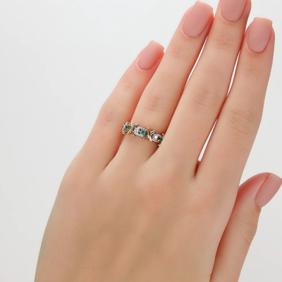 Кольцо с 3 бриллиантами природными, 0.09 карат, огранка круг 57 граней, цвет 3, чистота 6, тип огранки А; 3 изумрудами природными, 0.09 карат, цвет 3, чистота 3, тип огранки В; Желтое и белое золото 585 пробы.