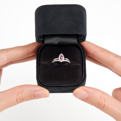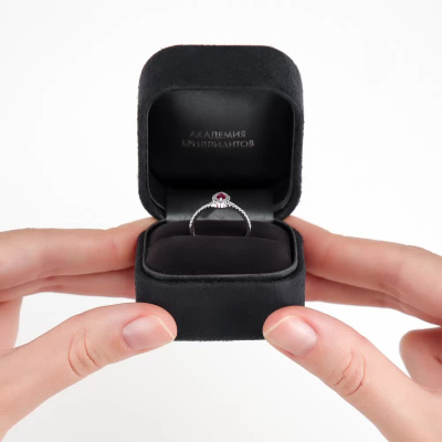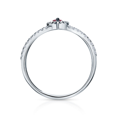 Кольцо с 34 бриллиантами природными, 0.11 карат, огранка круг 17 граней, цвет 2, чистота 2, тип огранки Б; 1 рубином природным, 0.15 карат, цвет 2, чистота 2, тип огранки Б; Белое золото 585 пробы.