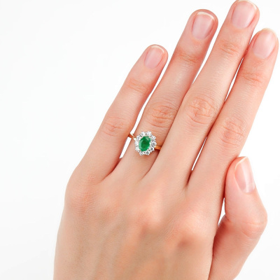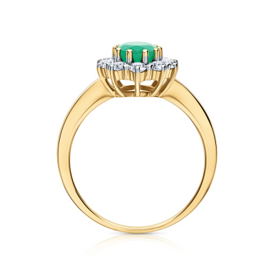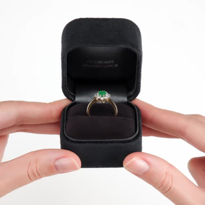 Кольцо с 10 бриллиантами природными, 0.38 карат, огранка круг 57 граней, цвет 3, чистота 6, тип огранки А; 1 изумрудом природным, 0.67 карат, цвет 3, чистота 3, тип огранки Б; Желтое золото 585 пробы.