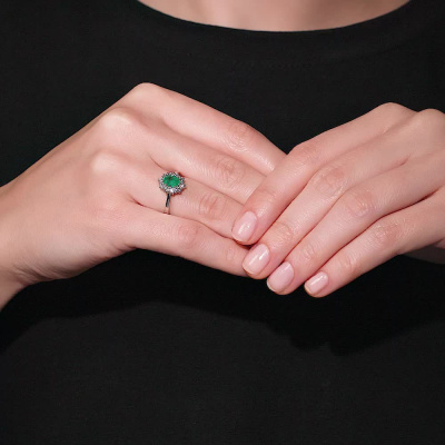 Кольцо с 10 бриллиантами природными, 0.36 карат, огранка круг 57 граней, цвет 3, чистота 6, тип огранки А; 1 изумрудом природным, 0.68 карат, цвет 3, чистота 3, тип огранки Б; Белое золото 585 пробы.