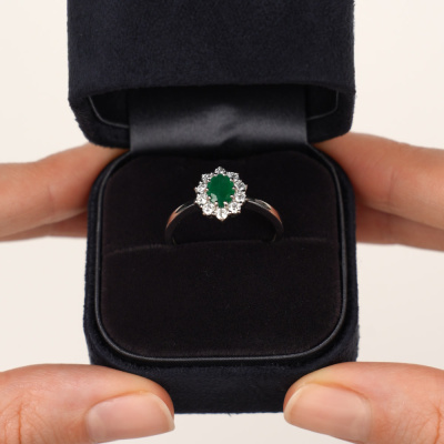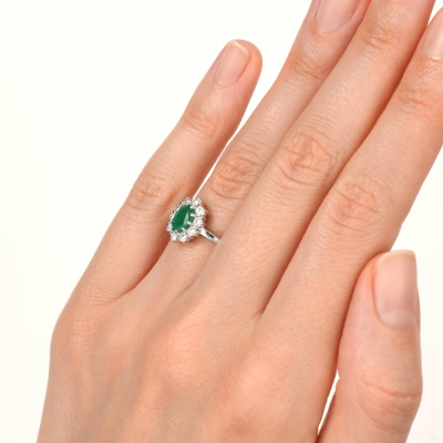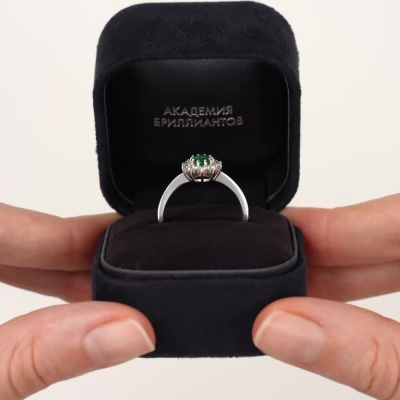 Кольцо с 10 бриллиантами природными, 0.369 карат, огранка круг 57 граней, цвет 3, чистота 6; 1 изумрудом природным, 0.684 карат, цвет 3, чистота 3; Белое золото 585 пробы.
