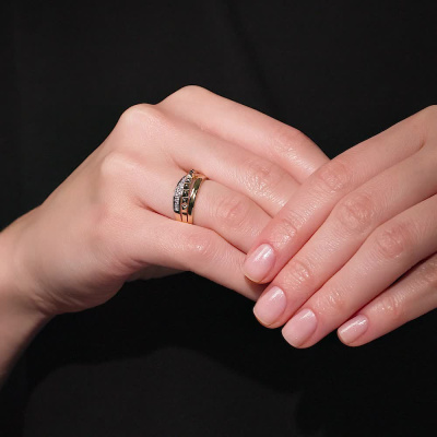 Кольцо с 5 бриллиантами природными, 0.04 карат, огранка круг 57 граней, цвет 3, чистота 6, тип огранки А; 28 бриллиантами природными, 0.09 карат, огранка круг 57 граней, цвет 3, чистота 6, тип огранки А; Желтое золото 585 пробы.