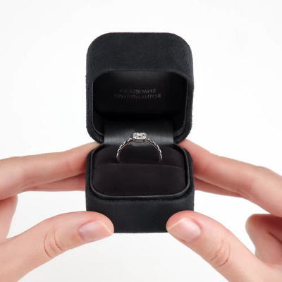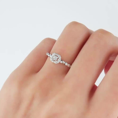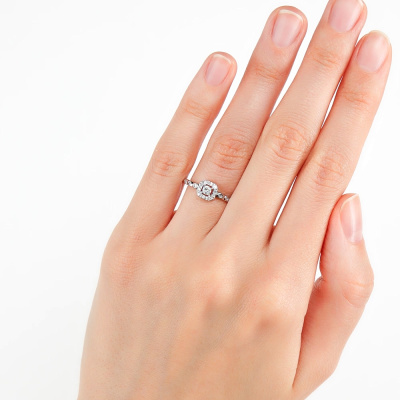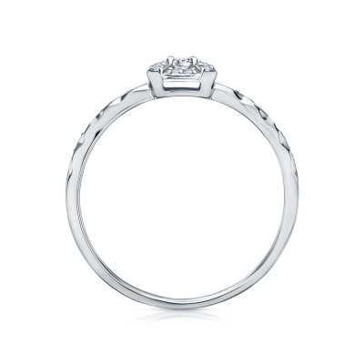 Кольцо с 1 бриллиантом природным, 0.09 карат, огранка круг 57 граней, цвет 4, чистота 6, тип огранки А; 20 бриллиантами природными, 0.08 карат, огранка круг 17 граней, цвет 2, чистота 2, тип огранки А; Белое золото 585 пробы.