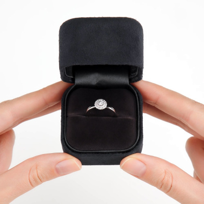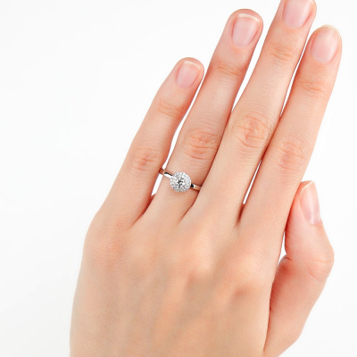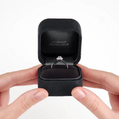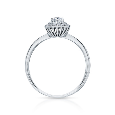 Кольцо с 1 бриллиантом природным, 0.18 карат, огранка круг 57 граней, цвет 4, чистота 5, тип огранки А; 33 бриллиантами природными, 0.1 карат, огранка круг 57 граней, цвет 4, чистота 5, тип огранки А; Белое золото 585 пробы.