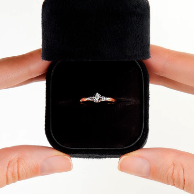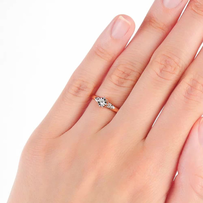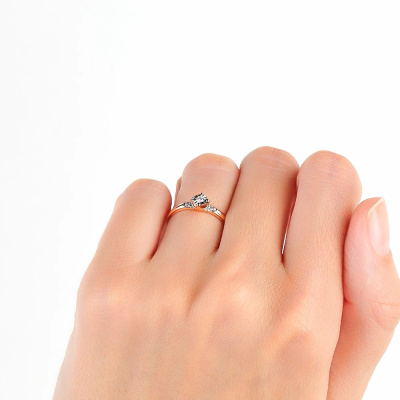 Кольцо с 1 бриллиантом природным, 0.03 карат, огранка круг 57 граней, цвет 3, чистота 6, тип огранки А; 2 бриллиантами природными, 0.009 карат, огранка круг 17 граней, цвет 2, чистота 2, тип огранки А; Розовое и белое золото 585 пробы.