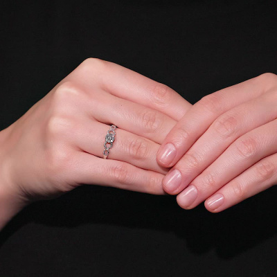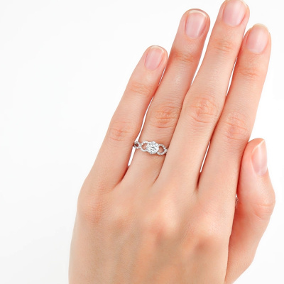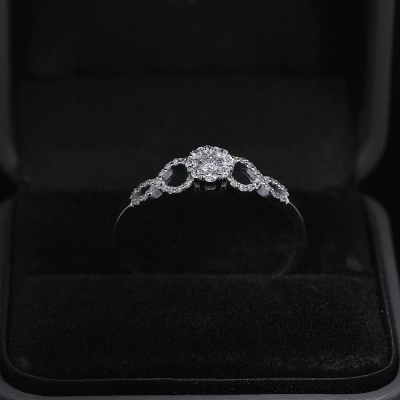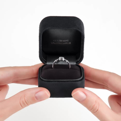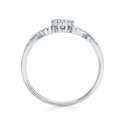 Кольцо с 1 бриллиантом природным, 0.08 карат, огранка круг 57 граней, цвет 3, чистота 6, тип огранки А; 8 бриллиантами природными, 0.11 карат, огранка круг 57 граней, цвет 3, чистота 6, тип огранки А; 30 бриллиантами природными, 0.1 карат, огранка круг 57 граней, цвет 3, чистота 6, тип огранки А; Белое золото 585 пробы.