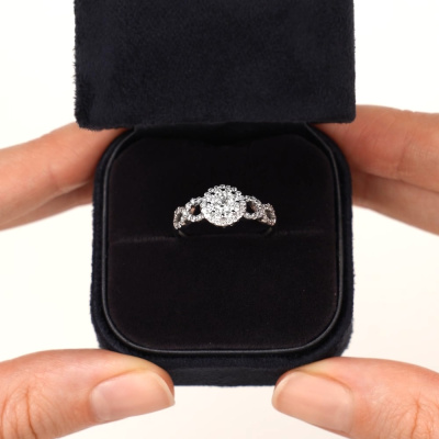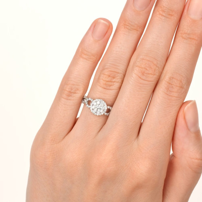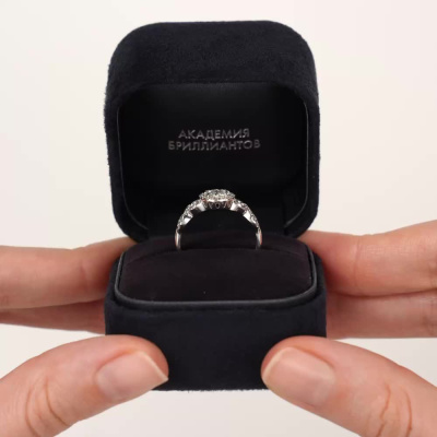Кольцо с 1 бриллиантом, 0.129 карат, огранка круг 57 граней, цвет 3, чистота 6, тип огранки А; 8 бриллиантами, 0.174 карат, огранка круг 57 граней, цвет 3, чистота 6, тип огранки А; 26 бриллиантами, 0.182 карат, огранка круг 57 граней, цвет 3, чистота 6, тип огранки А; 20 бриллиантами, 0.098 карат, огранка круг 57 граней, цвет 3, чистота 6, тип огранки А; Белое золото 585 пробы.