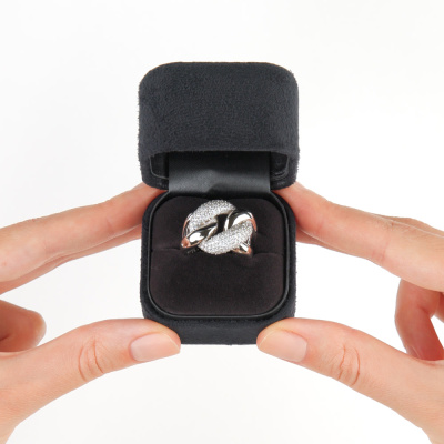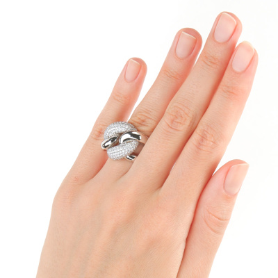 Кольцо с 158 бриллиантами, 1.13 карат, огранка круг 57 граней, цвет 3, чистота 6, тип огранки А; 60 бриллиантами, 0.25 карат, огранка круг 17 граней, цвет 2, чистота 2, тип огранки А; Белое золото 585 пробы.