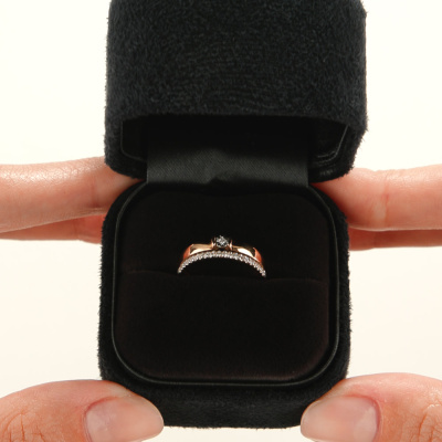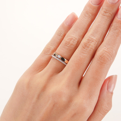 Кольцо с 1 бриллиантом природным, 0.007 карат, огранка круг 57 граней, цвет 3, чистота 6, тип огранки А; 21 бриллиантом природным, 0.08 карат, огранка круг 17 граней, цвет 2, чистота 2, тип огранки А; Розовое и белое золото 585 пробы.