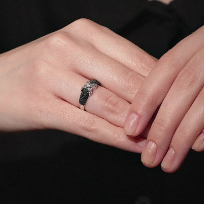 Кольцо с 34 бриллиантами природными, 0.07 карат, огранка круг 17 граней, цвет 2, чистота 2, тип огранки А; 114 бриллиантами черными природными облагороженными, 0.29 карат, огранка круг 57 граней, цвет 7, чистота 6, тип огранки А; Белое золото 585 пробы.