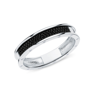 Кольцо с 70 бриллиантами черными облагороженными, 0.22 карат, огранка круг 57 граней, цвет 7, чистота 6, тип огранки А; 24 бриллиантами, 0.05 карат, огранка круг 57 граней, цвет 3, чистота 5, тип огранки А; Белое золото 585 пробы.