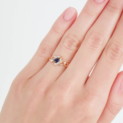 Кольцо с 4 бриллиантами природными, 0.01 карат, огранка круг 17 граней, цвет 2, чистота 2; 1 сапфиром синтетическим, 0.26 карат; Розовое золото 585 пробы.