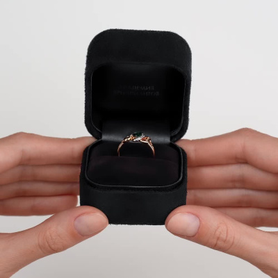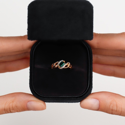 Кольцо с 4 бриллиантами природными, 0.01 карат, огранка круг 17 граней, цвет 2, чистота 2, тип огранки А; 1 гидротермальным изумрудом, 0.2 карат; Розовое золото 585 пробы.