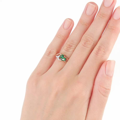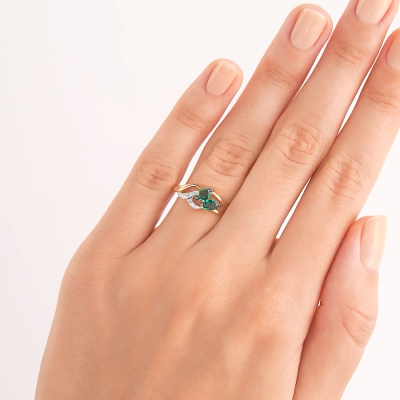 Кольцо с 4 бриллиантами природными, 0.01 карат, огранка круг 17 граней, цвет 2, чистота 2; 2 гидротермальными изумрудами, 0.43 карат; Розовое золото 585 пробы.