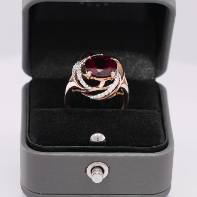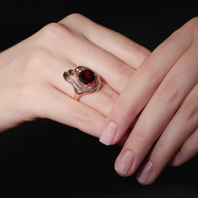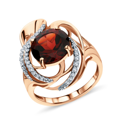 Кольцо с 1 гранатом, 4.165 карат, тип огранки В; 11 бриллиантами, 0.08 карат, огранка круг 57 граней, цвет 3, чистота 5, тип огранки А; 20 бриллиантами, 0.07 карат, огранка круг 57 граней, цвет 4, чистота 5, тип огранки А; Розовое золото 585 пробы.