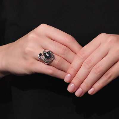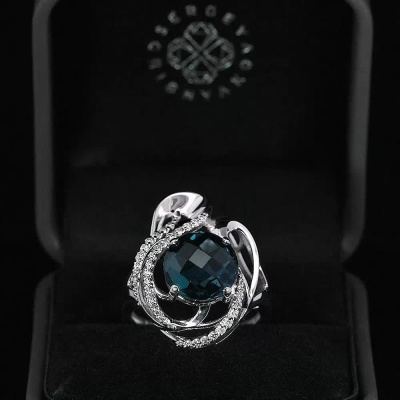 Кольцо с 1 топазом лондон, 4.67 карат, тип огранки В; 11 бриллиантами, 0.076 карат, огранка круг 57 граней, цвет 3, чистота 5, тип огранки А; 20 бриллиантами, 0.093 карат, огранка круг 57 граней, цвет 3, чистота 4, тип огранки А; Белое золото 585 пробы.