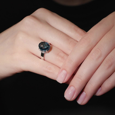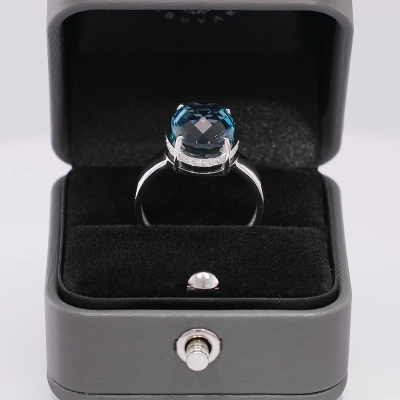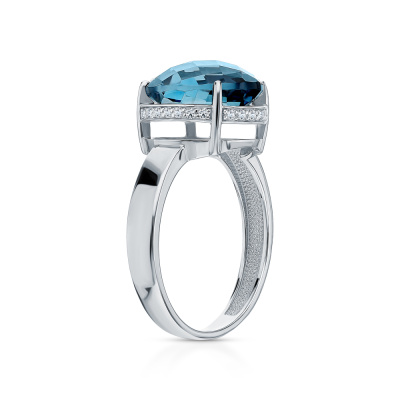 Кольцо с 26 бриллиантами природными, 0.13 карат, огранка круг 57 граней, цвет 3, чистота 6, тип огранки А; 1 топазом лондон природным, 5.63 карат, тип огранки А; Белое золото 585 пробы.