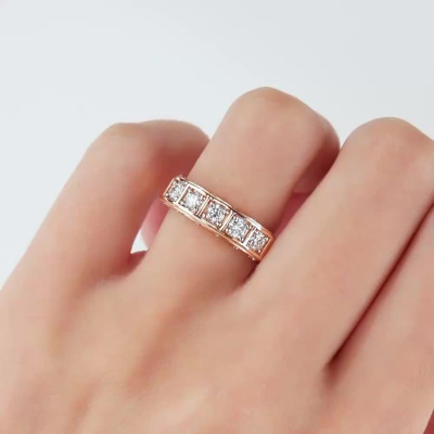 Кольцо с 5 бриллиантами природными, 0.51 карат, огранка круг 57 граней, цвет 3, чистота 6, тип огранки А; 12 бриллиантами природными, 0.03 карат, огранка круг 17 граней, цвет 2, чистота 2, тип огранки Б; Розовое золото 585 пробы.