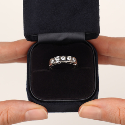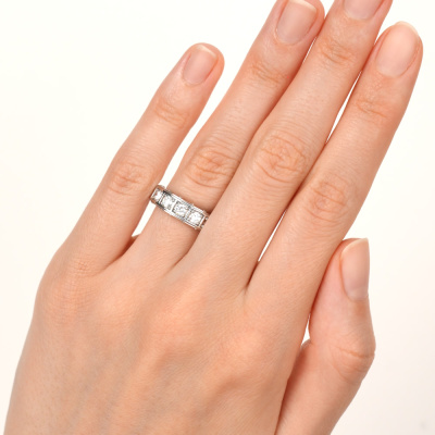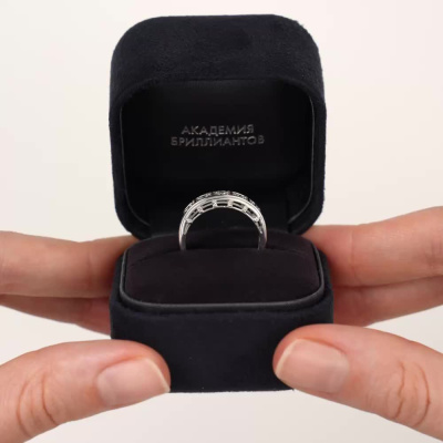 Кольцо с 5 бриллиантами природными, 0.51 карат, огранка круг 57 граней, цвет 3, чистота 6, тип огранки А; 12 бриллиантами природными, 0.03 карат, огранка круг 17 граней, цвет 2, чистота 2, тип огранки Б; Белое золото 585 пробы.