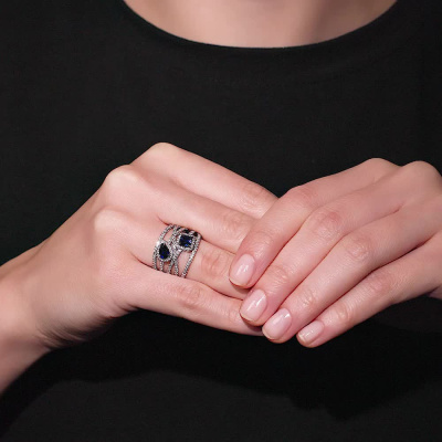 Кольцо с 1 сапфиром синтетическим, 0.54 карат, тип огранки Б; 1 сапфиром синтетическим, 0.48 карат, тип огранки Б; 154 бриллиантами, 0.46 карат, огранка круг 17 граней, цвет 2, чистота 2, тип огранки Б; 46 бриллиантами, 0.08 карат, огранка круг 17 граней, цвет 2, чистота 2, тип огранки А; Белое золото 585 пробы.