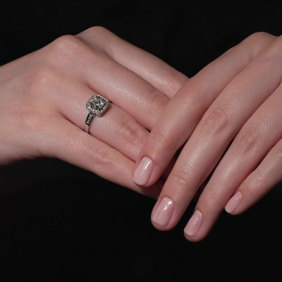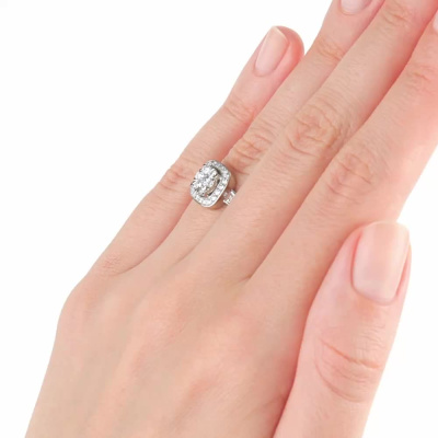 Кольцо с 1 бриллиантом природным, 0.07 карат, огранка круг 57 граней, цвет 3, чистота 6, тип огранки А; 6 бриллиантами природными, 0.18 карат, огранка круг 57 граней, цвет 3, чистота 6, тип огранки А; 24 бриллиантами природными, 0.18 карат, огранка круг 57 граней, цвет 3, чистота 6, тип огранки А; 2 бриллиантами природными, 0.008 карат, огранка круг 57 граней, цвет 3, чистота 6, тип огранки А; Платина 950 пробы.