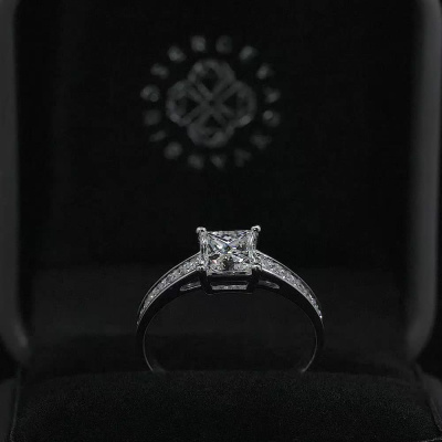 Кольцо с 1 бриллиантом природным, 1.01 карат, огранка принцесса 65 граней, цвет 3, чистота 6, тип огранки А; 16 бриллиантами природными, 0.24 карат, огранка круг 57 граней, цвет 3, чистота 6, тип огранки А; Белое золото 585 пробы.