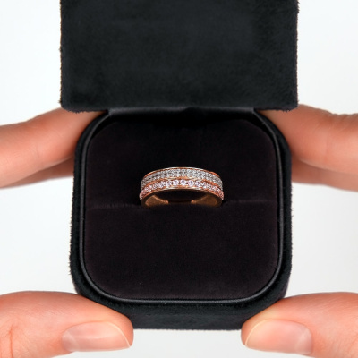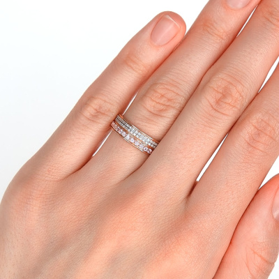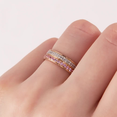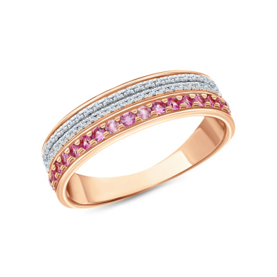 Кольцо с 50 бриллиантами природными, 0.11 карат, огранка круг 17 граней, цвет 2, чистота 2, тип огранки А; 17 сапфирами розовыми природными, 0.38 карат, тип огранки В; Розовое золото 585 пробы.