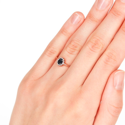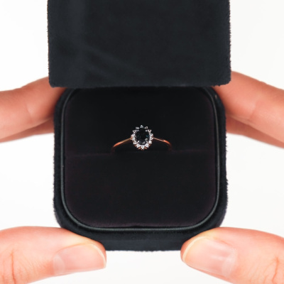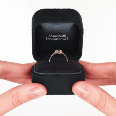 Кольцо с 14 бриллиантами природными, 0.03 карат, огранка круг 57 граней, цвет 3, чистота 6, тип огранки А; 1 сапфиром природным, 0.41 карат, цвет 2, чистота 2, тип огранки Б; Розовое золото 585 пробы.