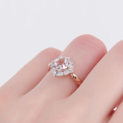Кольцо с 16 бриллиантами природными, 0.05 карат, огранка круг 17 граней, цвет 2, чистота 2, тип огранки А; 1 морганитом природным, 0.88 карат; Розовое золото 585 пробы.