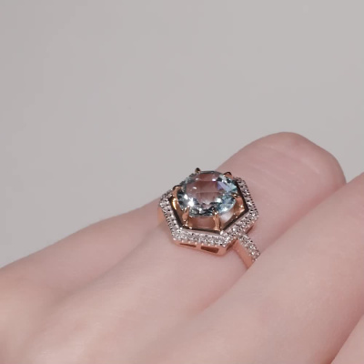 Кольцо с 56 бриллиантами природными, 0.11 карат, огранка круг 17 граней, цвет 2, чистота 2, тип огранки А; 1 топазом скай природным, 2.25 карат, огранка круг чекер; Розовое золото 585 пробы.