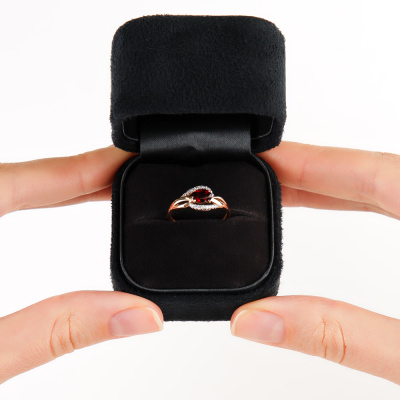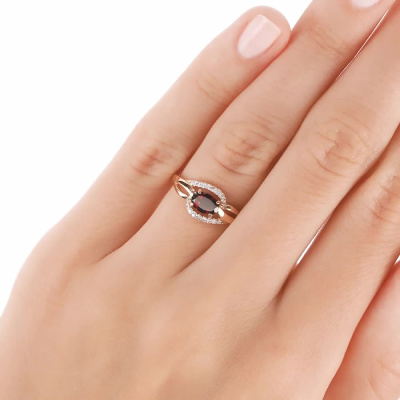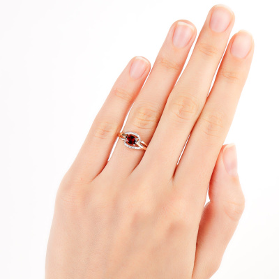 Кольцо с 18 бриллиантами природными, 0.07 карат, огранка круг 17 граней, цвет 2, чистота 2, тип огранки А; 1 гранатом природным, 0.54 карат; Розовое золото 585 пробы.