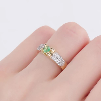 Кольцо с 26 бриллиантами природными, 0.23 карат, огранка круг 57 граней, цвет 4, чистота 6, тип огранки А; 1 изумрудом природным, 0.14 карат, цвет 3, чистота 3, тип огранки В; Желтое золото 585 пробы.