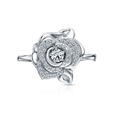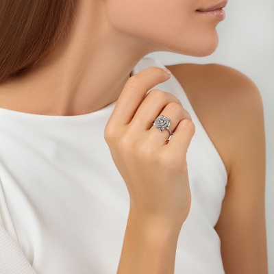 Кольцо с 1 бриллиантом природным, 0.11 карат, огранка круг 57 граней, цвет 3, чистота 6, тип огранки А; 39 бриллиантами природными, 0.14 карат, огранка круг 17 граней, цвет 2, чистота 2, тип огранки Б; Белое золото 585 пробы.