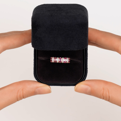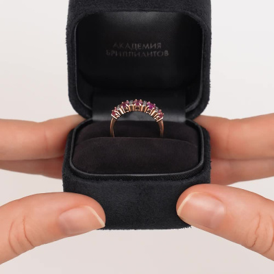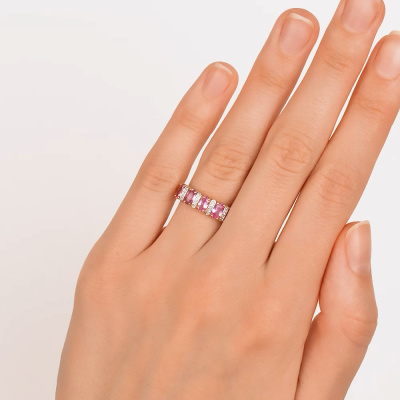 Кольцо с 20 бриллиантами природными, 0.03 карат, огранка круг 17 граней, цвет 2, чистота 2, тип огранки А; 5 сапфирами розовыми природными, 1.36 карат; Розовое золото 585 пробы.