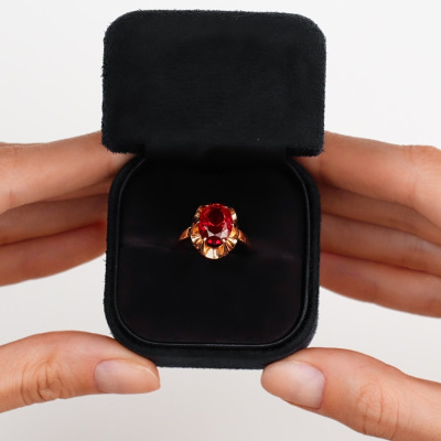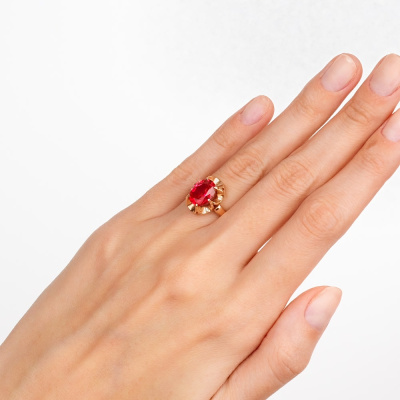 Кольцо с синтетическим рубином весом 3.188 карата и типом огранки Б — настоящая находка для ценителей утонченности и элегантности. Изготовленно из розового золота 585 пробы. Украшение обладает особым очарованием и изысканностью. Будьте уверены, что это кольцо привлечет восхищенные взгляды и подчеркнет индивидуальность.