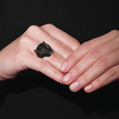 Кольцо с 2 гидротермальными изумрудами, 0.24 карат; 6 синтетическими черными шпинелями, 0.06 карат; 316 синтетическими черными шпинелями, 1.89 карат; Розовое золото 585 пробы.