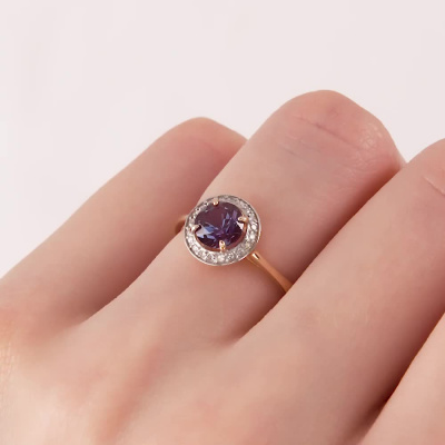 Золотое кольцо с бриллиантами природными и александритом выращенным