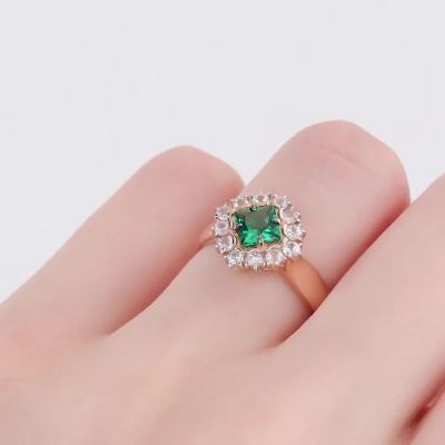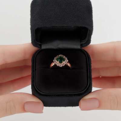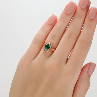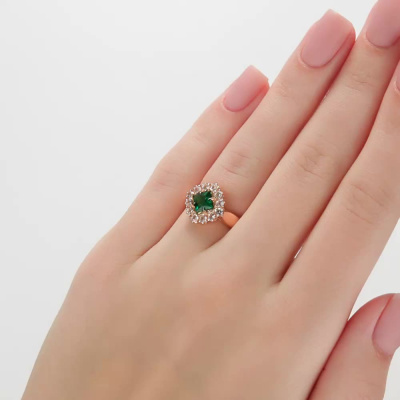 Кольцо с 1 гидротермальным изумрудом, 0.49 карат; 12 сапфирами бесцветными природными, 0.5 карат; Розовое золото 585 пробы.