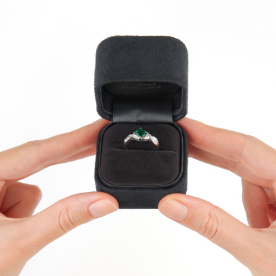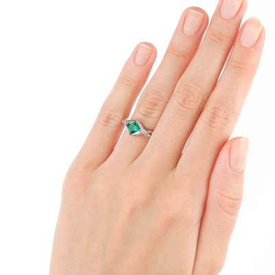 Кольцо с 2 бриллиантами природными, 0.016 карат, огранка круг 17 граней, цвет 2, чистота 2, тип огранки А; 22 бриллиантами природными, 0.048 карат, огранка круг 17 граней, цвет 2, чистота 2, тип огранки А; 1 гидротермальным изумрудом, 0.502 карат; Белое золото 585 пробы.