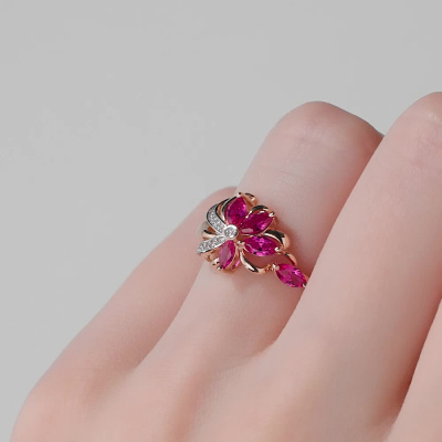 Кольцо с 1 бриллиантом природным, 0.009 карат, огранка круг 17 граней, цвет 2, чистота 2, тип огранки А; 16 бриллиантами природными, 0.03 карат, огранка круг 17 граней, цвет 2, чистота 2, тип огранки А; 4 рубинами синтетическими, 0.58 карат; 1 рубином синтетическим, 0.08 карат; Розовое золото 585 пробы.