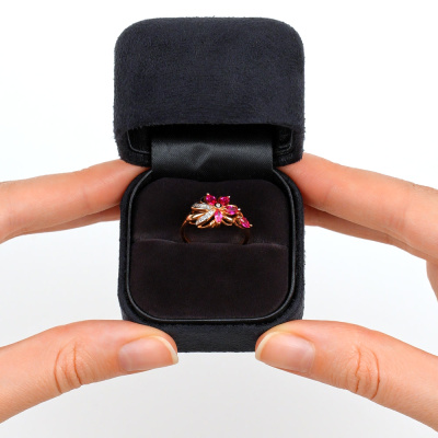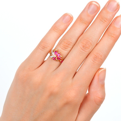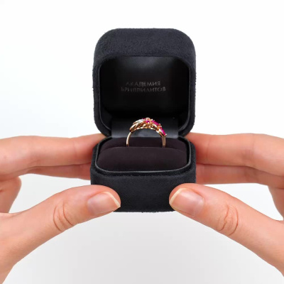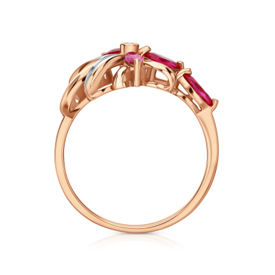 Кольцо с 1 бриллиантом природным, 0.009 карат, огранка круг 17 граней, цвет 2, чистота 2, тип огранки А; 16 бриллиантами природными, 0.034 карат, огранка круг 17 граней, цвет 2, чистота 2, тип огранки А; 4 рубинами синтетическими, 0.577 карат; 1 рубином синтетическим, 0.081 карат; Розовое золото 585 пробы.