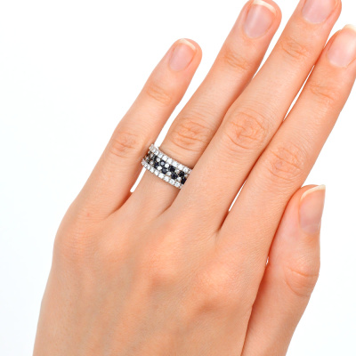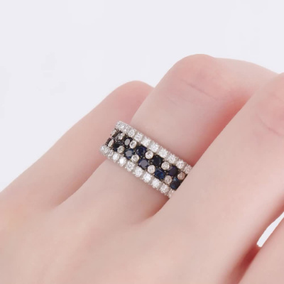 Кольцо с 30 бриллиантами природными, 0.4 карат, огранка круг 57 граней, цвет 3, чистота 6, тип огранки А; 15 бриллиантами природными, 0.07 карат, огранка круг 17 граней, цвет 2, чистота 2, тип огранки А; 15 сапфирами природными, 0.79 карат, цвет 2, чистота 2, тип огранки В; Белое золото 585 пробы.
