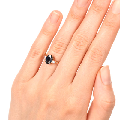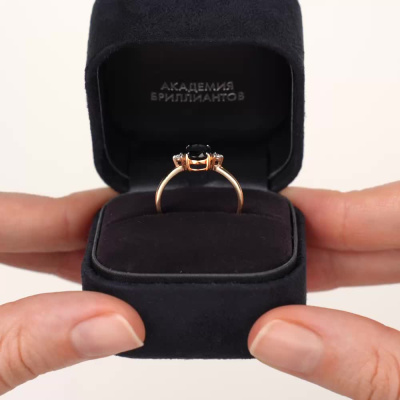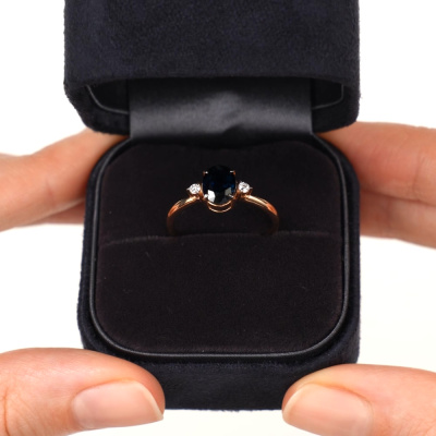 Кольцо с 2 бриллиантами природными, 0.06 карат, огранка круг 57 граней, цвет 3, чистота 6, тип огранки А; 1 сапфиром природным, 1.43 карат, цвет 2, чистота 2, тип огранки Б; Розовое золото 585 пробы.