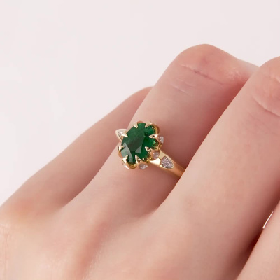 Кольцо с 1 изумрудом, 1.06 карат, цвет 4, чистота 2, тип огранки Б; 2 бриллиантами, 0.01 карат, огранка круг 57 граней, цвет 3, чистота 6, тип огранки А; 8 бриллиантами, 0.03 карат, огранка круг 17 граней, цвет 2, чистота 2, тип огранки А; Желтое золото 585 пробы.